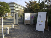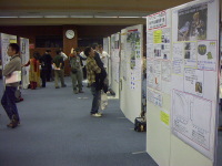 | 受付。木漏れ陽の差し込む中、研究発表の学生さんや関係者の方々が続々来場。賑わいを見せ始める。 | ![]() |