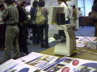 「うわっ!」「これが私の血?」「こんなハッキリ映るもんなんですね」ご自分の血液を位相差顕微鏡ご覧になった方々の様々な驚きの声。 実際に目に見える、というインパクトはやはりかなり大きいようです。 「位相差顕微鏡の特徴として、観察物の輪郭がすごく鮮明に見えるんですよ」物珍しそうに覗いていく方、熱心に聞き入る方。たくさんの方々に興味を持っていただきました。 |