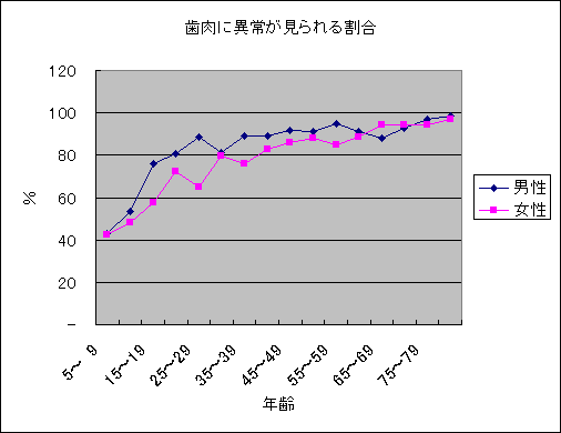 歯石の沈着や歯周ポケットが深い(4mmを超える)など歯肉に異常がある人の割合は年齢と共に増加します。